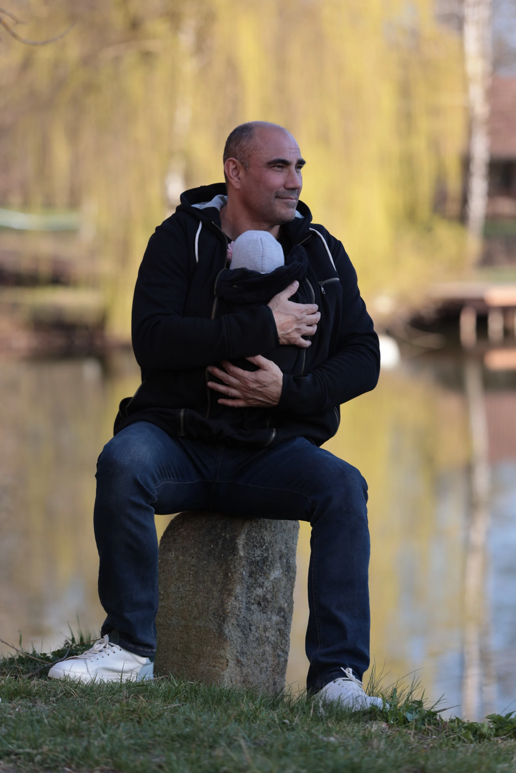 Nosící mikina je perfektní i jako doplněk k pánské nosící softshellové bundě. Oba produkty můžete vrstvit na sebe a miminko tak máte možnost nosit i v zimě.
