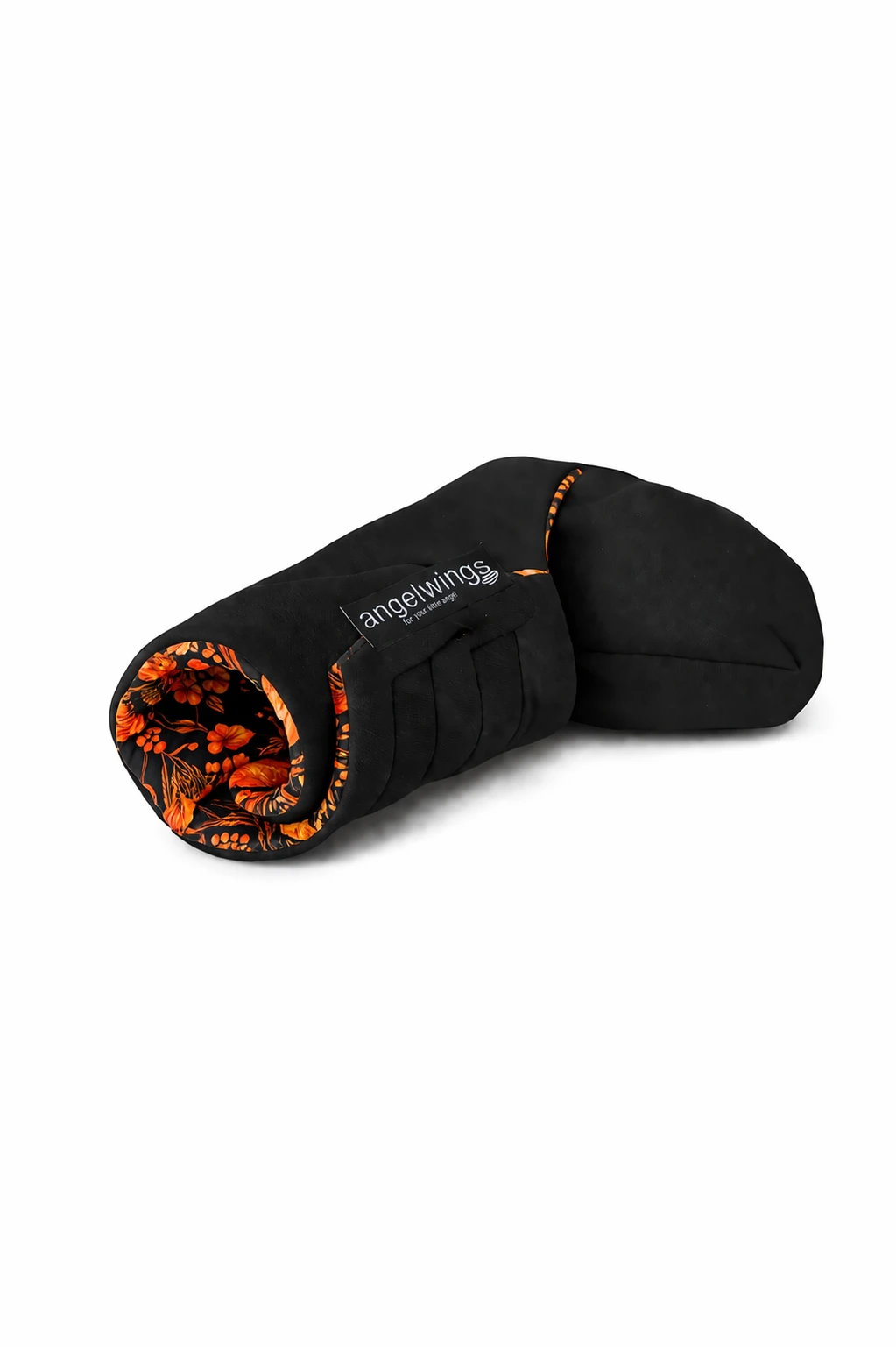Vnější vrstva je ze softshellu – ve stejné barvě najdete i skvělé nosící bundy a nosící softshellové kabátky pro maminky a dokonce i bundy pro nosící tatínky. Na vnitřní část jsme použili bavlnu se vzorem oranžových květin